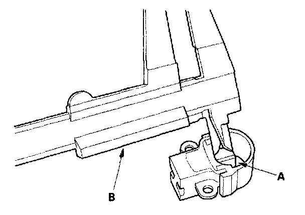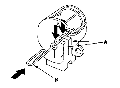 19. Push the brushes (A) in, then insent a pin or drill bit (B) (about 1.6 mm (0.06 in.) diameter) to hold them there.