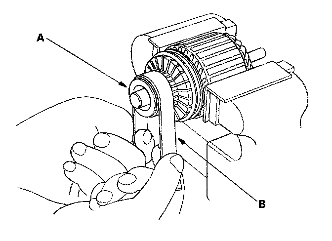 7. Check the commutator (A) surface. If the surface is dirty or burnt, resurface with emery cloth or a lathe within the following specifications, or recondition with #500 or #600 sandpaper (B).