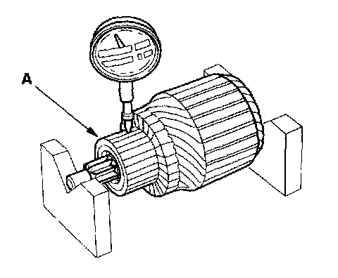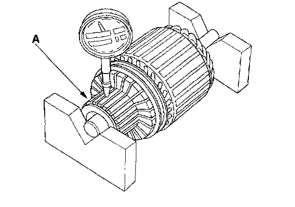 4. Check the commutator (A) surface. If the surface is dirty or burnt, resurface with emery cloth or a lathe within the following specifications, or recondition with #500 or #600 sandpaper (B).