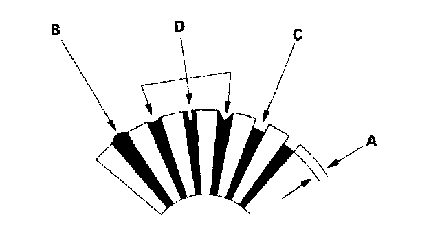10. Check the mica depth (A). If the mica is too high (B), undercut the mica with a hacksaw blade to the proper depth. Cut away all the mica (C) between the commutator segments. The undercut should not be too shallow, too narrow, or V-shaped (D).