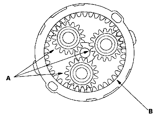 13. Check the planetary gears (A) and ring gear (B). Replace them if they are worn or damaged.