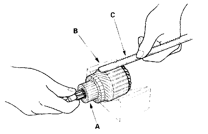 12. Place the armature (A) on an armature tester (B). Hold a hacksaw blade (C) on the armature core. If the blade is attached to the core or vibrates while the core is turned, the armature is shorted. Replace the armature.