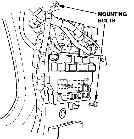 4. Remove the two mounting bolts from the under-dash fuse/relay box, then pull the fuse box away from the body.