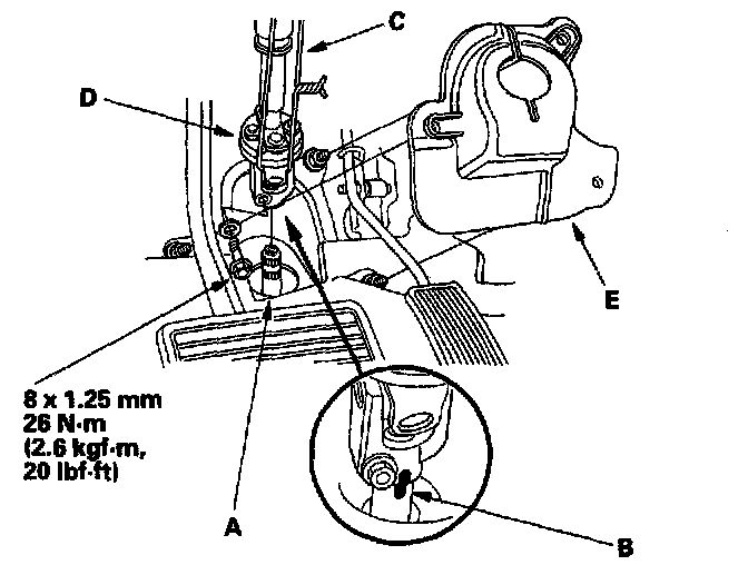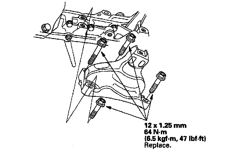 8. Install the rear engine mount (A), rear engine mount upper mounting bolt (B), and shift cable bracket (C).