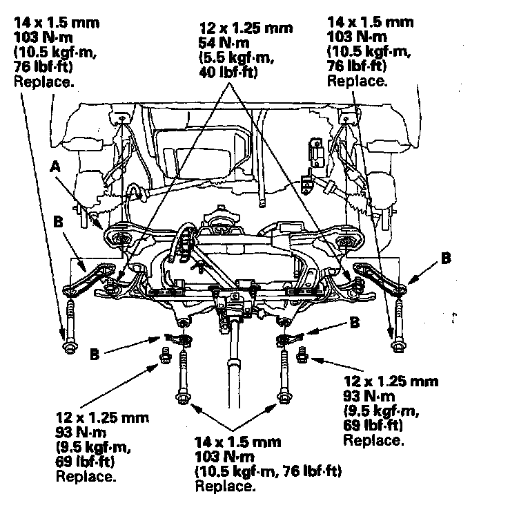 11. Install the front suspension subframe (A) and front suspension subframe stays (B).