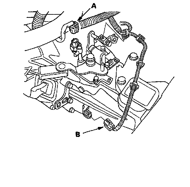 41. Connect the back-up light switch connector (A) and output shaft (countershaft) speed sensor connector (B).