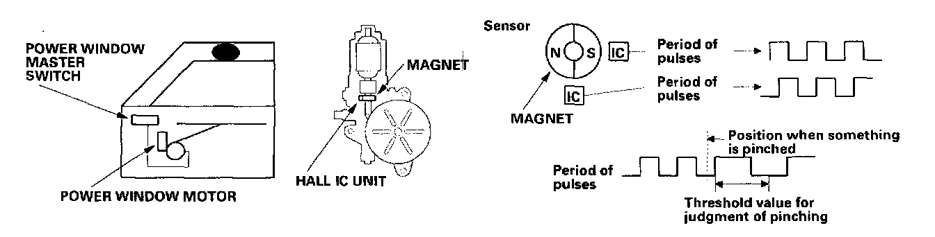 The system is composed of the power window master switch, the power window master switch and the driver's window motor. The power window motor incorporates a pulser which generates pulses during the motor's operation and sends the pulses to the power window control unit. As soon as the power window master switch detects no pulses from the pulser, the control unit makes the power window motor stop and reverse. This is to prevent pinching your hand or fingers during auto-up operation.