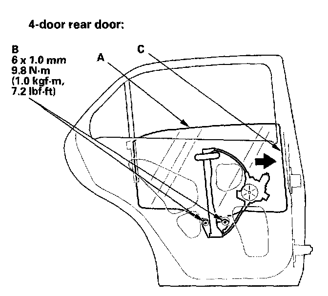 6. Raise the glass fully, and check for gaps. Also check that the glass (A) contacts the glass run channel (B) evenly.