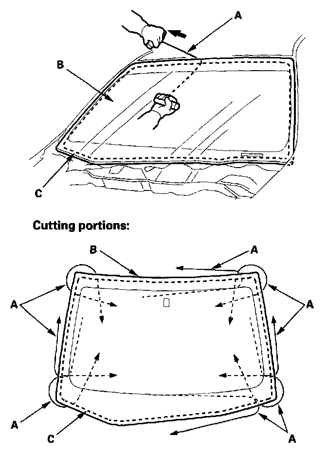 6. With a helper on the outside, pull the piano wire (A) back and forth in a sawing motion. Hold the piano wire as close to the windshield (B) as possible to prevent damage to the body and dashboard. Carefully cut through the rubber dam and adhesive (C) around the entire windshield.