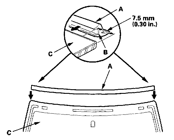 12. Glue the molding (A) with adhesive tape (B) (3M 4212, or equivalent) to the upper edge of the windshield (C). Be careful not to touch the windshield where adhesive will be applied.