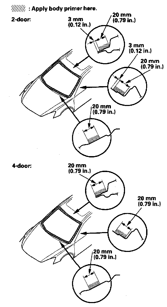 - Do not apply body primer to the windshield, and do not get body and glass primer sponges mixed up.