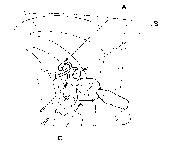 3. Disconnect the combination light switch 12P connector (A) and dashboard wire harness 8P connector (B) from the wiper/washer switch (C).