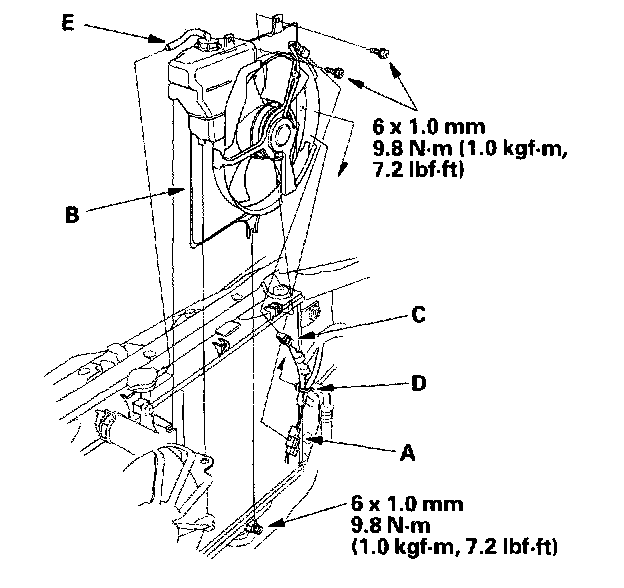 6. Remove the compressor clutch connector (A) from the condenser fan shroud (B), Disconnect the condenser fan connector (C), then remove the wire harness clip (D) from the condenser fan shroud. Remove the hose (E) from the radiator. Loosen the lower mounting bolts, then remove the upper mounting bolts and the condenser fan shroud. Be careful not to damage the radiator fins when removing the condenser fan shroud.