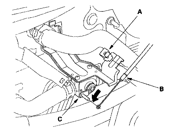 4. From under the hood, open the cable clamp (A), then disconnect the heater valve cable (B) from the heater valve arm (C). Turn the heater valve arm to the fully opened position as shown.