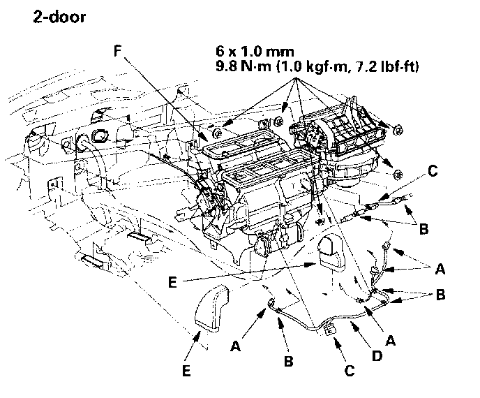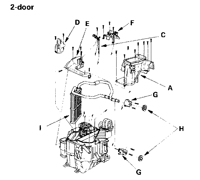 10. Remove the self-tapping screws, the evaporator temperature sensor (C) and the joint duct A, then remove the self-tapping screws and the joint duct B (4-door). Remove the self-tapping screws, then remove the passenger's heater outlet (D), and the heater core cover (E). Remove the self-tapping screws and the mode control motor (F) (2-door). Remove the self-tapping screws, the heater pipe brackets (G), the grommets (H) and carefully pull out the heater core (I) so you don't bend the inlet outlet pipes.