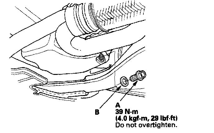 3. Reinstall the drain bolt with a new washer (B).