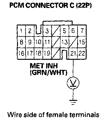5. Measure the voltage between PCM connector terminal C21 and body ground.
