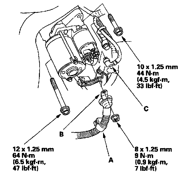 5. Disconnect the starter cable (B) from the B terminal, then disconnect the BLK/WHT wire (C) from the S terminal.