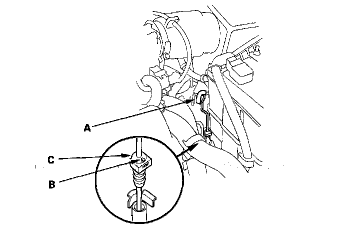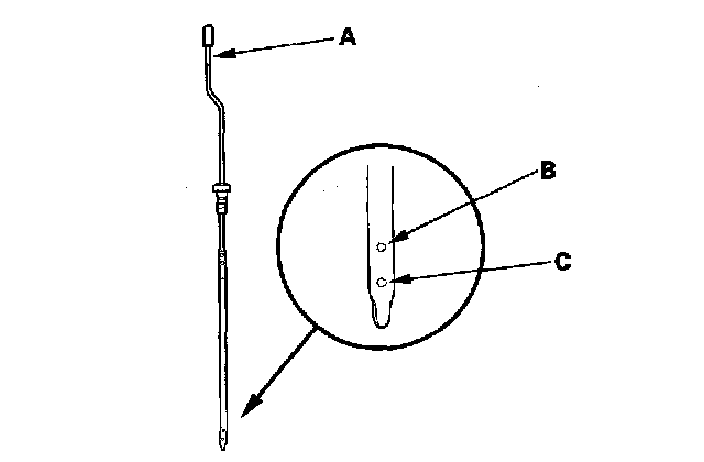 6. Remove the dipstick (A) and check the fluid level. It should be between upper mark (B) and lower mark (C).