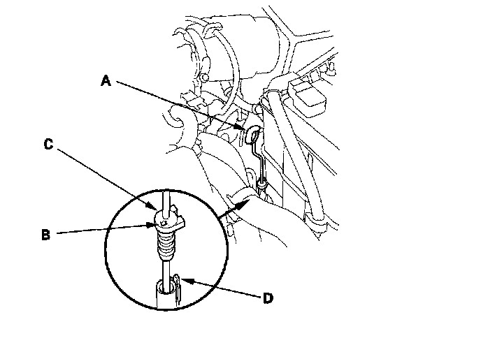 5. For 2004-2007 models: Insert the dipstick (A) back with pointing the arrow (B) on the cap (C) to the front of the vehicle, and aligning the notch on the cap with the guide tab (D).
