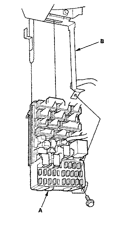 5. Remove the mounting bolt and slide the under-dash fuse/relay box (A) down from the bracket (B).