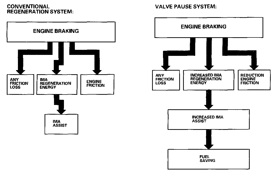 The valve pause system is designed to reduce engine friction by stopping the intake/exhaust valves of the No.2, No.3, and No.4 cylinders during deceleration. The energy corresponding to the reduced volume of the engine brake power is applied to the regenerated (generation) energy of the IMA motor. As the regenerated energy increases, the system increases the assist power of the IMA motor during acceleration, to improve fuel economy.