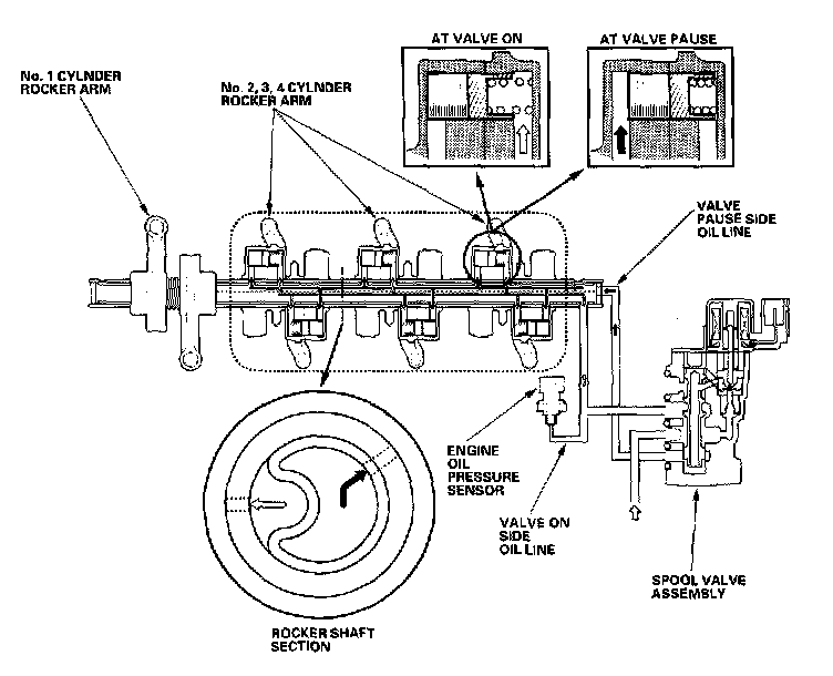 The Valve Pause System uses a synchronizing piston to lock and unlock the rocker arms from the camshaft. The synchronizing piston is driven in and out of the rocker arm by oil pressure supplied by two oil passages in the rocker shaft and controlled by a 3-way spool valve. The synchronizing piston also has a light return spring to hold the rocker in the on position when there is no oil pressure. This allows the valves to operate during engine start when oil pressure is low.