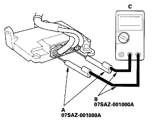 2. Connect the backprobe adapters (A) to the stacking patch cords (B), and connect the cords to a multimeter (C).