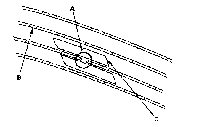2. Carefully mask above and below the broken portion of the defogger wire (B) with transparent tape (C).