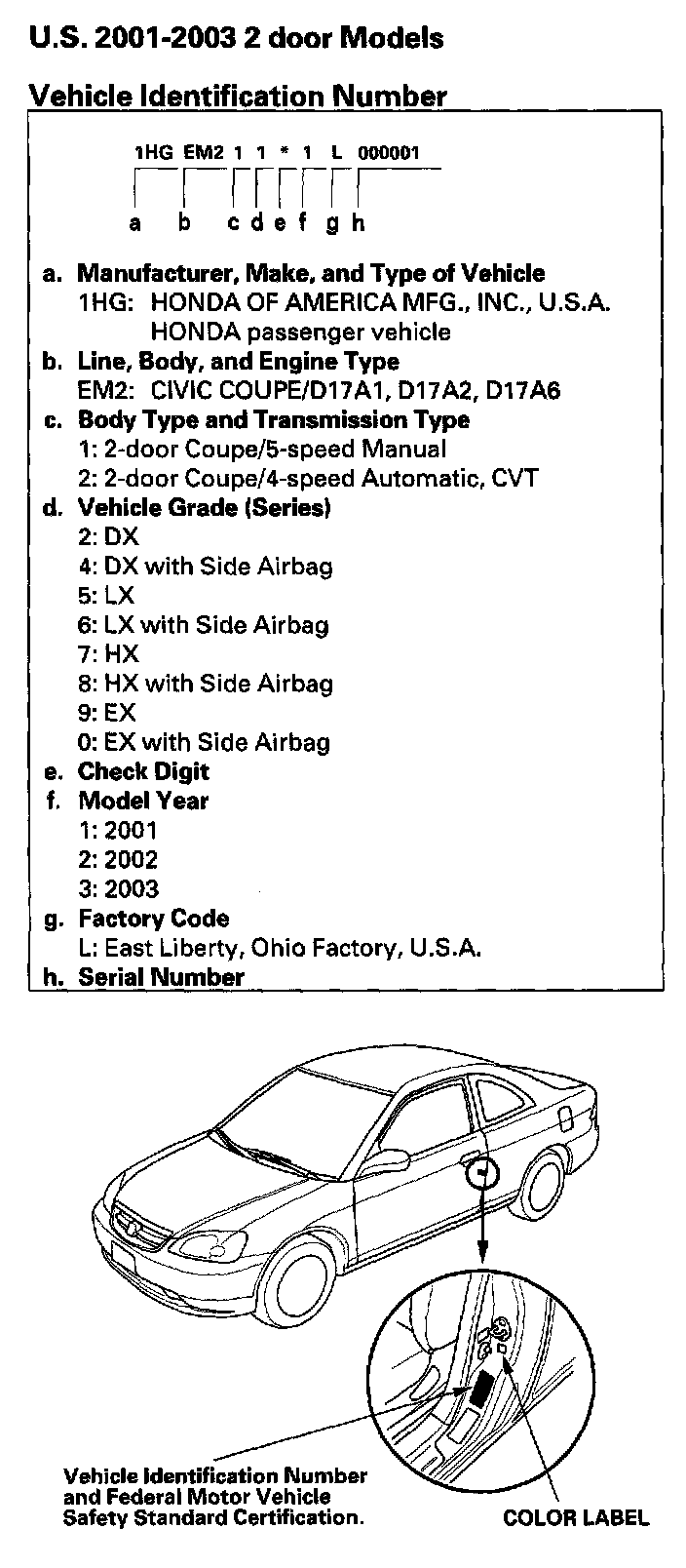 Vehicle Identification Number - U.S Model 2-door: