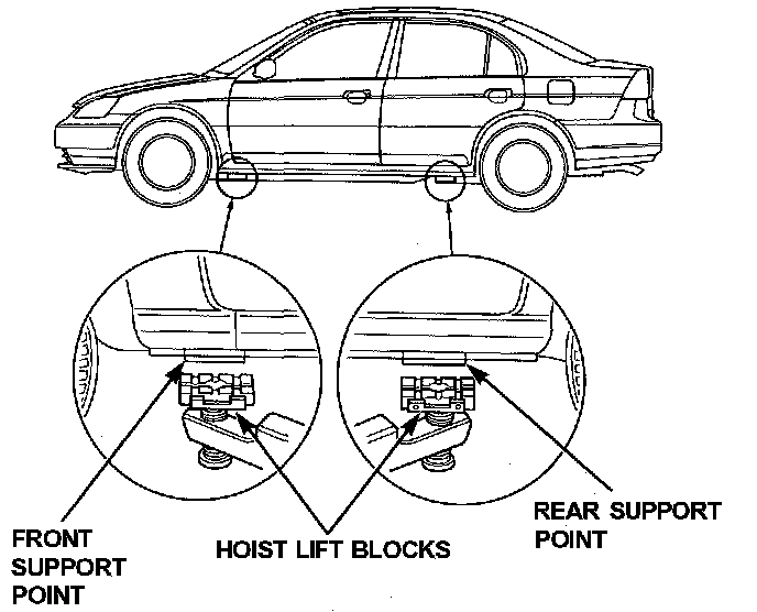 Lift and Support PointsNOTE: If you are going to remove heavy components such as suspension or the fuel tank from the rear of the vehicle, first support the front of the vehicle with tall safety stands. When substantial weight is removed from the rear of the vehicle, the center of gravity can change and cause the vehicle to tip forward on the hoist.