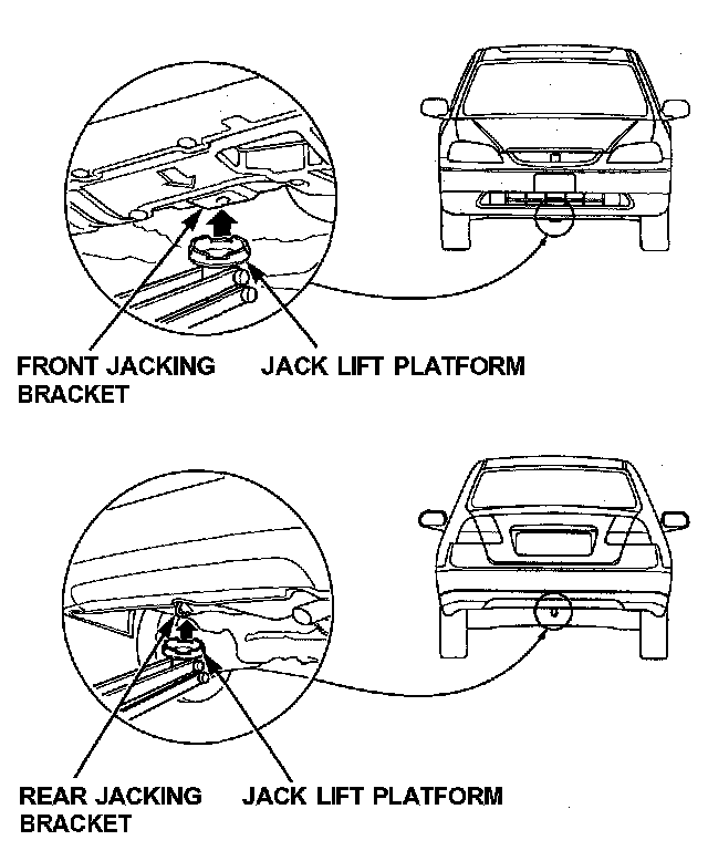 4. Position the floor jack under the front jacking bracket or rear jacking bracket, center the jacking bracket in the jack lift platform, and jack up the vehicle high enough to fit the safety stands under it.