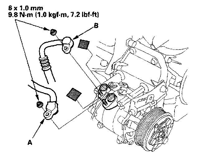 7. Remove the nuts, then disconnect the suction line (A) and discharge line (B) from the compressor. Plug or cap the lines immediately after disconnecting them to avoid moisture and dust contamination.