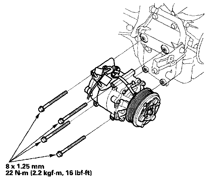 8. Remove the mounting bolts and the compressor. Be careful not to damage the radiator fins when removing the compressor.