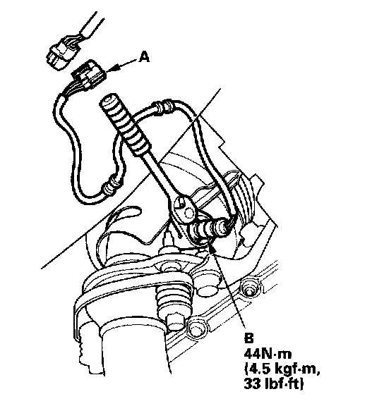 1. Disconnect the secondary HO2S 4P connector (A), then remove the secondary HO2S (B).