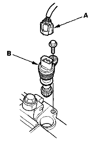 2. Disconnect the 3P connector (A) from the vehicle speed sensor (VSS) (B).
