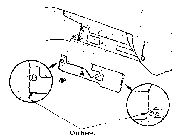 2. Remove the bolt. Cut the plastic cross brace in the glove box opening with diagonal cutters in the area shown, and discard it.