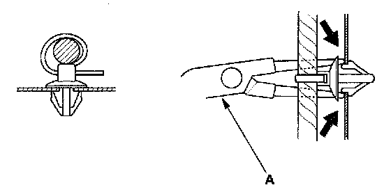 - Slip pliers (A) under the clip base and through the hole at an angle, then squeeze the expansion tabs to release the clip.