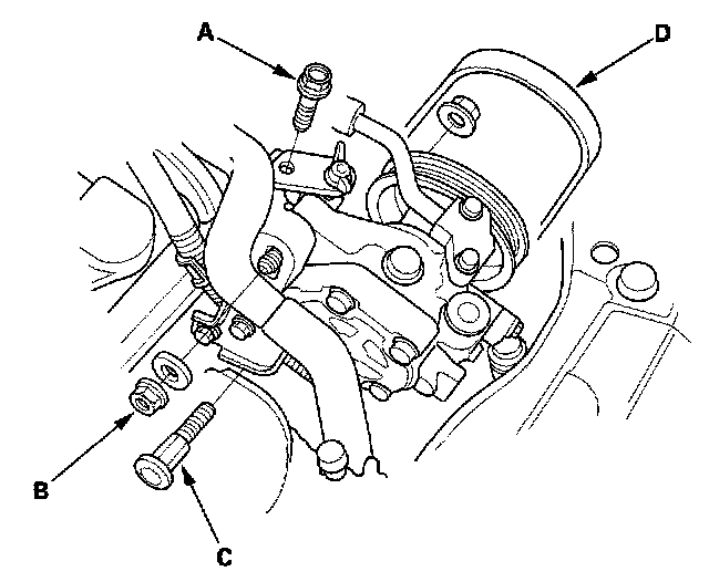 3. Remove the adjust plate mounting bolt (A), locknut (B), and mounting bolt (C), then remove the power steering (P/S) pump belt (D) and pump without disconnecting the P/S hoses.