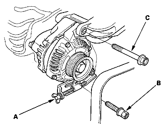 5. Loosen the adjusting bolt (A), and remove the lock bolt (B) and mounting bolt (C), then remove the alternator belt and alternator.