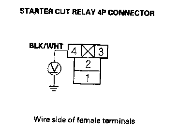 8. Measure voltage between starter cut relay 4P connector terminal No. 2 and body ground with the ignition switch in the START (III) position.