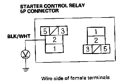 15. Measure voltage between starter control relay 5P connector terminal No. 5 and body ground with the ignition switch in the START (III) position.