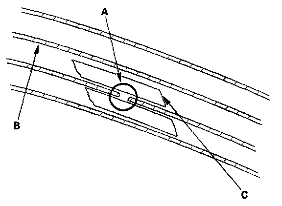 2. Carefully mask above and below the broken portion of the defogger wire (B) with transparent tape (C).