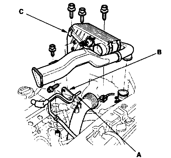 27. Install the upper radiator hose (A), lower radiator hose (B), and heater hoses (C).