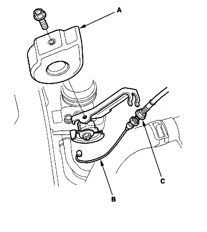 9. Remove the throttle cover (A), then remove the throttle cable (B) by loosening the locknut (C), then slipping the cable end out of the accelerator linkage. Take care not to bend the cable when removing it. Always replace any kinked cable with a new one.