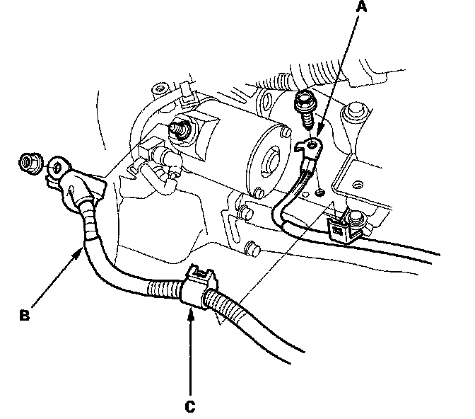 11. Remove the ground cable (A), starter cable (B), and harness clamp (C).
