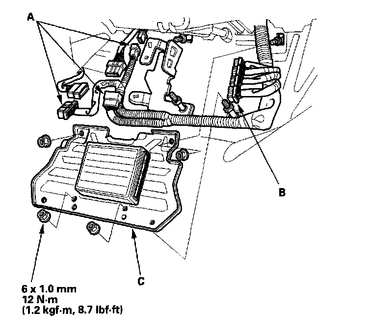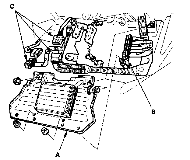 14. Remove the engine control module (ECM) cover (A), then disconnect the ECM connectors (B) and the main wire harness connectors (C).