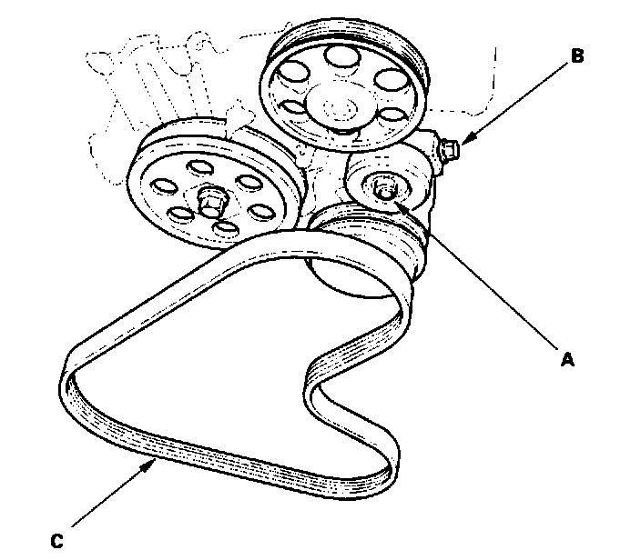 18. Loosen the idler pulley center nut (A), then turn the adjusting bolt clockwise (B). Remove the water pump-A/C compressor belt (C) (with ARC).