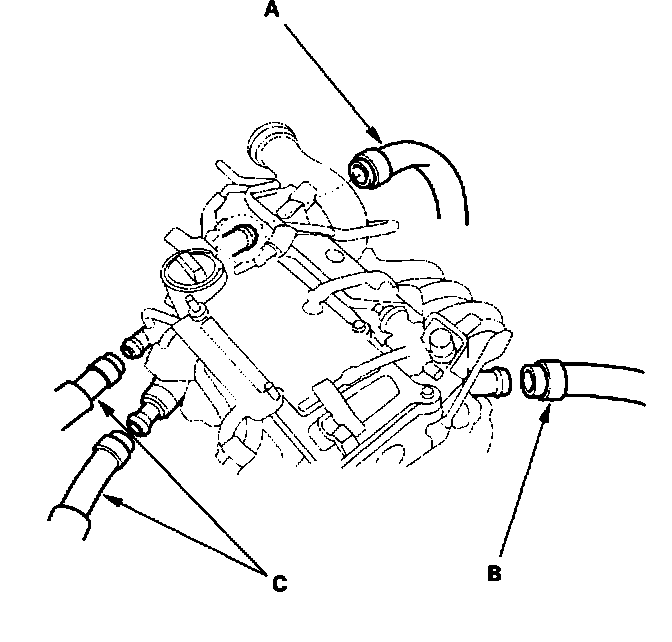 38. Remove the upper radiator hose (A), lower radiator hose (B), and heater hoses (C).