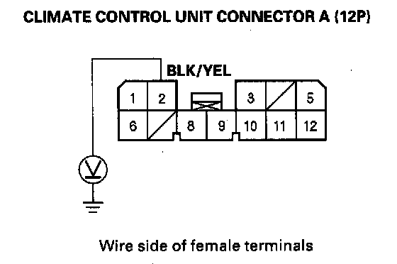 4. Measure the voltage between the No. 2 terminal of climate control unit connector A (12P) and body ground.